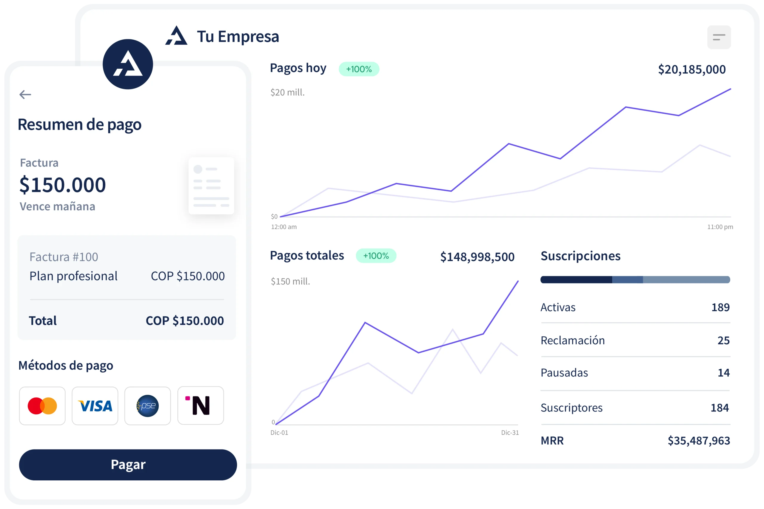 Ofrece una experiencia de pago fluida a tus clientes, sin importar el dispositivo que utilicen (móvil o de escritorio), a través de tarjeta de crédito y débito, PSE, Nequi, DaviPlata e incluso efectivo.